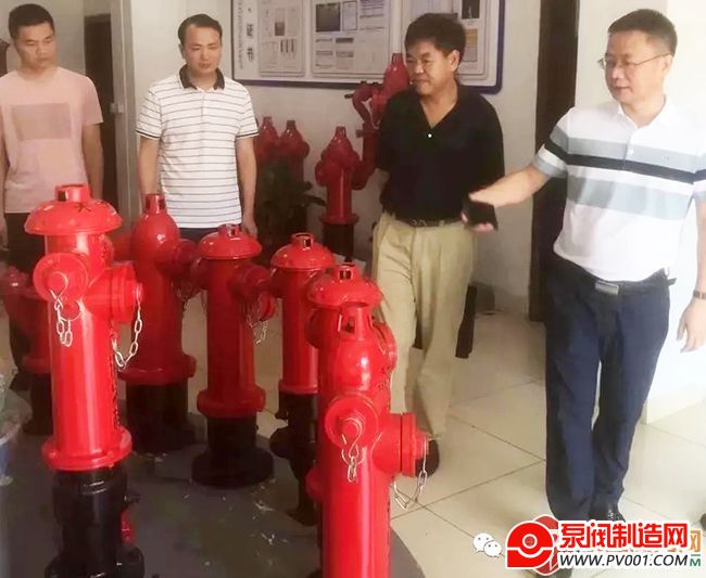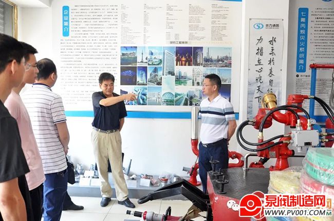 考察组一行首先参观了水力消防科技有限公司的消防产品展示厅,展示厅内有序摆放着琳琅满目的不同类别的产品,公司董事长王秋良不时向考察组领导介绍不同消防产品的性能、用途、产量等基本情况,领导们边听介绍边详细了解。