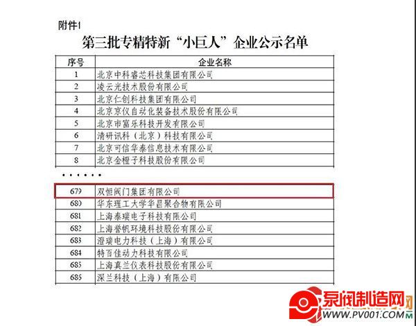 7月19日,国家工信部发布专精特新“小巨人”企业名单,双恒阀门成功入选!“专精特新”是指“专业化、精细化、特色化、新颖化”,“专精特新小巨人”企业是层层筛选出来的的佼佼者,是专注于细分市场、创新能力强、市场占有率高、掌握关键核心技术、质量效益优的排头兵企业。