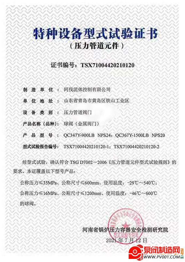 ●阿伐公司喜获两项阀门型式试验证书