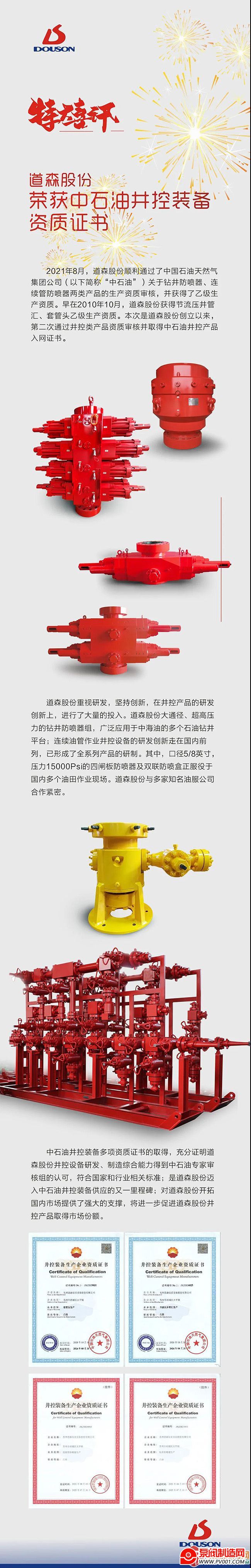 道森股份荣获中石油井控装备资质证书
