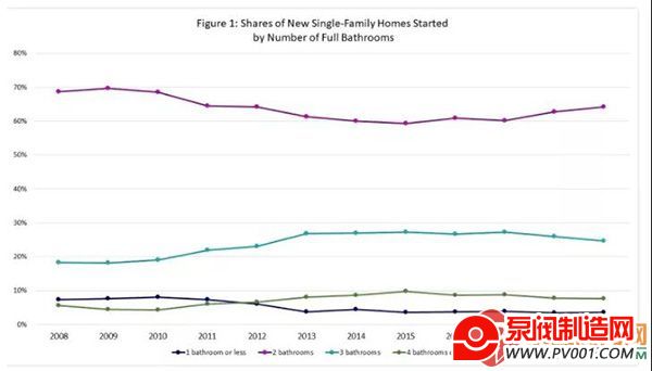 在疫情发生前,美国人口普查局建筑调查(SOC)显示,2019年美国新开工的单户住宅的浴室和半浴室数量和份额发生了变化。据数据显示,4%的新单户住宅开工有一间浴室或更少,64%有2间浴室,25%有3间浴室,8%有4间浴室或更多。