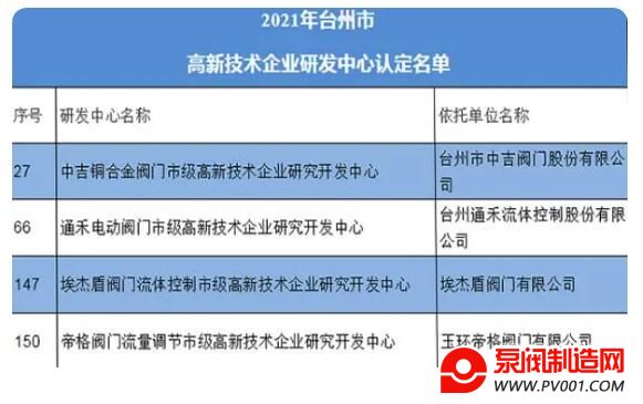 其中,帝格阀门流量调节市级高新技术企业研究开发中心、埃杰盾阀门流体控制市级高新技术企业研究开发中心、通禾电动阀门市级高新技术企业研究开发中心、中吉铜合金阀门市级高新技术企业研究开发中心上榜名单。