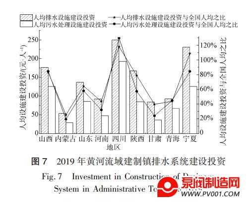 污水处理设施建设中,管网建设投资一般为处理厂建设投资的3倍左右。2019 年,沿黄 9 省(区)建制镇排水设施建设投资为 82. 5 亿元,其中,管网建设投资为 29 亿元,仅为污水处理厂建设投资的54. 3%,管网建设存在较大的资金缺口(图7)。在建制镇建设资金来源中,中央、省级和市县 财政资金投入超过一半,融资方式单一、资金投入不 足是造成管网建设滞后的关键因素。