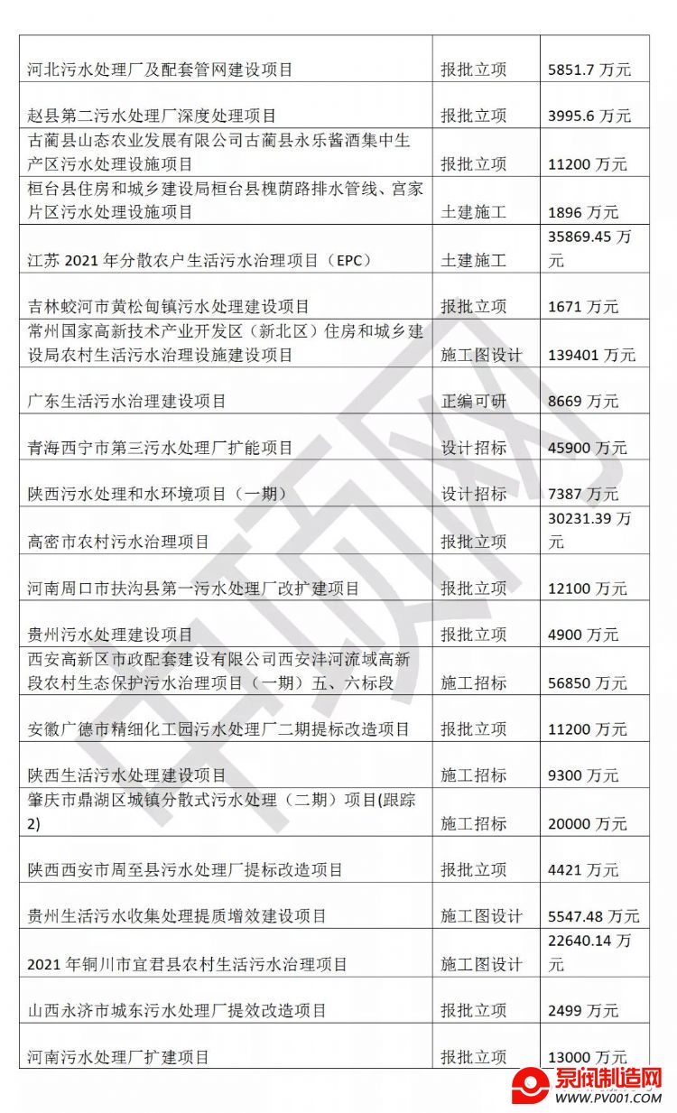 2021年铜川市宜君县农村生活污水治理项目,1、项目建设地址:陕西省铜川市。2、项目内容:本项目共建设集中式污水处理站112座,设计总规模为2820吨/天。污水收集管网工程:本项目配套建设DN300污水收集管网总长度191.2km,DN100入户预留管总长度38.32km。3、项目总投资:22640.14万元。