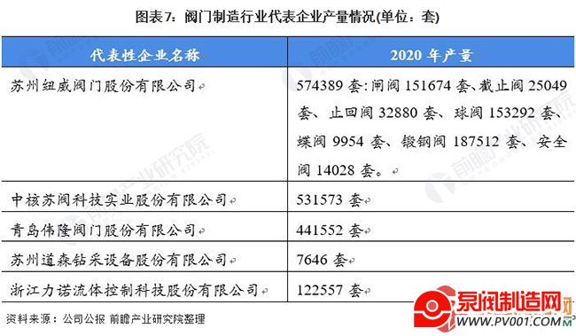 阀门制造行业代表企业产量情况