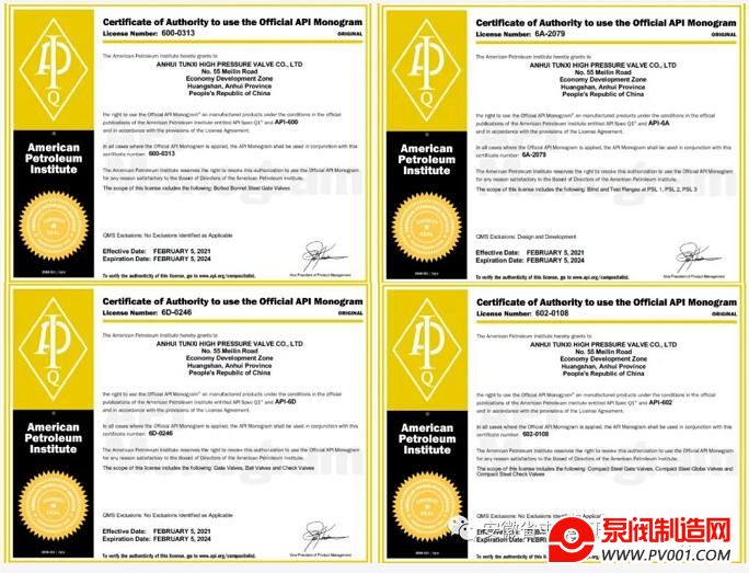 近日,安徽省屯溪高压阀门有限公司4个API会标产品的换证审核顺利通过及证书的获得,代表公司的产品符合API标准规范要求及公司的质量管理体系也得到了进一步提升。为更好的服务于客户,公司不断优化产品结构,生产符合国际标准认可的优质阀门产品,为公司国内外业务开展奠定基础,也提高了公司产品的竞争力。