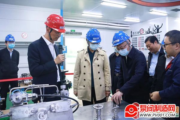 调研组领导们参观了公司二号基地核电球阀车间,并听取了吴总关于公司组织党员干部集体学习二十大会议精神的感悟,以及疫情以来公司的生产经营情况和在智转数改方面取得的新成就。