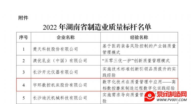 2022年11月2日,省工信厅正式公布31家2022年湖南省制造业质量标杆企业,宇环数控成功入选。这是对公司在质量建设与管理方面所做工作的高度肯定,也是公司全面落实质量强企方针有力印证。