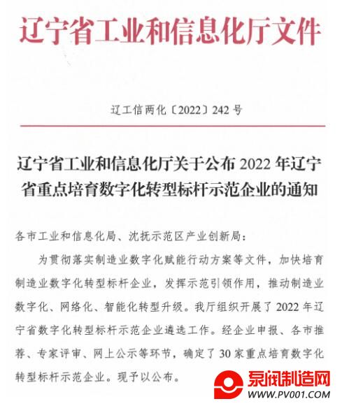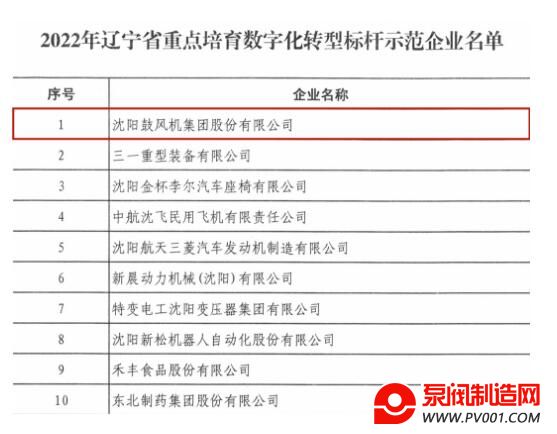 日前,辽宁省工业和信息化厅公布了《2022年辽宁省重点培育数字化转型标杆示范企业名单》,沈阳鼓风机集团股份有限公司以榜首位置成功入选!