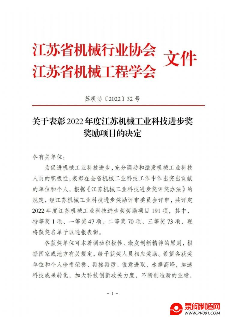 再添省级荣誉!江苏省机械行业协会下发《关于表彰2022年度江苏机械工业科技进步奖奖励项目的通报》,江苏诚功阀门科技有限公司联合常州工学院、南京航天航空大学申报的《海洋油气长输管线用长寿命多级降压控制阀研发及产业化》项目荣获江苏机械工业科技进步一等奖。