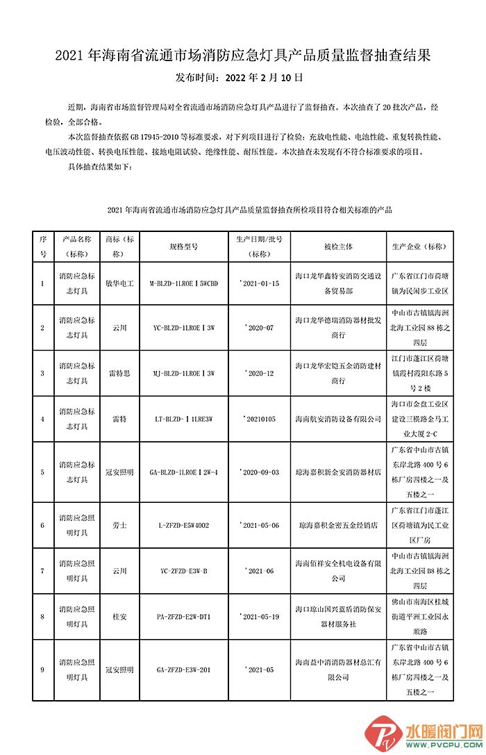 您当前的位置:中国泵阀制造网 > 资讯 > 企业资讯 > 海南省市场监管局抽检消防应急灯具20批次均合格