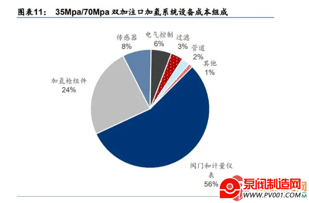 氢用阀门技术要求严苛,国产化降本成为重点。目前氢能产业链中电堆、膜电极、双极板 等核心部件已基本完成国产化,但氢用阀门因其技术难度大,仍然存在卡脖子问题。据神 通新能源总经理孙明民(2021.5.8,高工氢能产业峰会),目前氢用阀门应用问题包括:1) 传统阀门的动作机构在氢用压力等级(35~90MPa)下失效;2)在超高压工况下,密封设 计技术无法实现氢气密封;3)氢气的“腐蚀性”会使金属材料发生氢脆(断裂韧性急剧 下降),导致故障;4)传统的高压阀门无法满足车载系统复杂工况。据工信部《新能源汽 车推广应用推荐车型目录》,单台载重 3.5 吨的燃料电池物流车制造成本约为 80 万~100 万 元,对应阀门成本为 6 万~7 万元。而在加氢设备中阀门同样重要,据 Ahmad Mayyas 等 人的加氢站制造竞争力分析(2019),加氢系统设备成本中最主要的为阀门和计量仪表等, 接近设备成本的 60%。