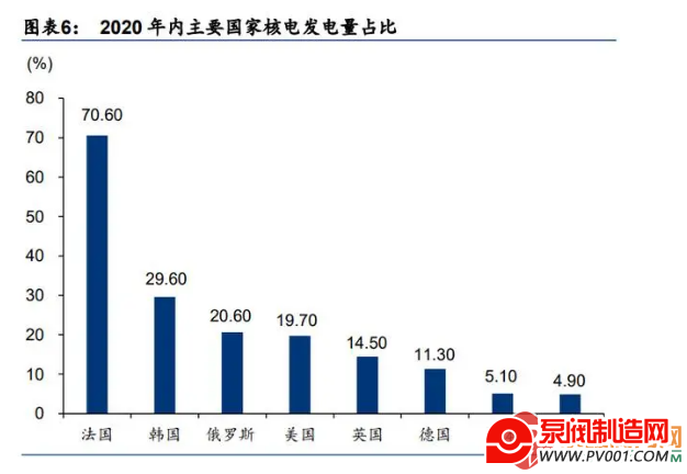 受益于国家政策,公司核电阀门订单和收入稳步增长。随着我国经济发展和对清洁能源需 求的持续扩大,核电作为可批量规模化建设的安全高效清洁能源,未来在国家能源建设需 求中将占据极其重要的地位,因此无论是国内核电新项目还是“核电走出去”项目,都有 望进一步拉动核电阀门设备的市场需求。2020 年公司核电阀门新增订单 6.55 亿元,同比增速达到 63.75%,2021 年上半年核电阀门领域实现营业收入 2.54 亿元,同比增长 64.93%。核电新机组建设速度有望加快,对标海外提升空间较大。据中国核能行业协会,截至 2020 年底我国商运核电机组总装机容量 5102.7 万千瓦,核准及在建核电机组总装机约 2099 万千瓦,预计 2025 年我国核电在运及在建装机有望达到 7000 万千瓦和 3000 万千 瓦;2035 年核电在运和在建装机容量有望达至 2 亿千瓦左右,2021-2035 CAGR 7.05%。据世界核能行业协会,与其他国家相比,中国 2020 年核能发电量占比为 4.9%,而法国核 能发电量占比为 70.6%。2021 年政府工作报告首次用“积极”二字描述核电建设,我们 认为较高的新能源渗透率下,核电发电能力更为可靠,利用欧洲国家高占比核电运营经验, 我国核电发展提升空间较大。未来 15 年是我国核电发展的重要战略机遇期,据国家核安 全局,2019 年以来我国核电新机组批准恢复,19~21 年分别批准 4、4、5 台核电新机组。据江苏神通 20 年年报,“十四五”期间每年有望批复建设 6-8 台核电新机组,考虑到核电 阀门产品较长的交付周期(核电机组建设周期约 60 个月),核电建设或逐步加速。