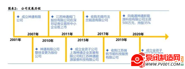 持续布局拓展下游赛道,外延发展打通关键环节。公司前身为神通有限公司,成立于 2001 年。2004 年获得核安全局颁发的设计、制造许可证。2010 年,公司在中小企业板上 市。2011年,公司成立江苏神通能源装备科技有限公司,布局能源化工产业。2015 年以 来,公司外延式发展加速,全资收购无锡市法兰锻造。2017 年,公司收购江苏瑞帆节能 科技服务有限公司,打通节能阀门从生产到应用的各个环节。2019 年,公司拓展氢能源 应用领域特种阀门,向南通神通新能源科技有限公司注资 500 万元(占比 35%)。2020 年 公司设立子公司江苏神通核能装备有限公司,核电业务再优化。