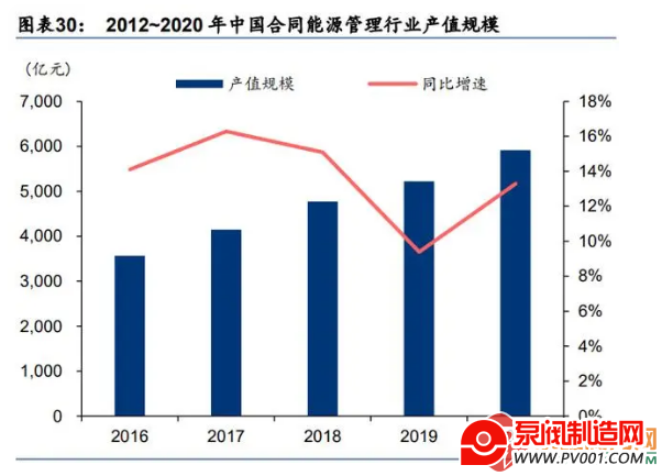 缓解节能行业投资不足,EMC 行业成长显著。合同能源管理(EMC)是近年来国家重点 推行的一种以运用市场手段促进节能减排的机制。EMC 公司为用能企业投资建设节能改 造项目并提供节能服务,优点是有望克服传统节能工作中节能资金不足,节能效率低等问 题。“十三五”期间,节能服务产 业总产值相比于“十二五”基本实现倍增,新增年节能能力近 2 亿吨标准煤;截止 2020 年底,节能服务产业总产值 5916.53 亿元,年节能能力 4050.06 万吨标准煤,相当于减排 10172.27 万吨二氧化碳。