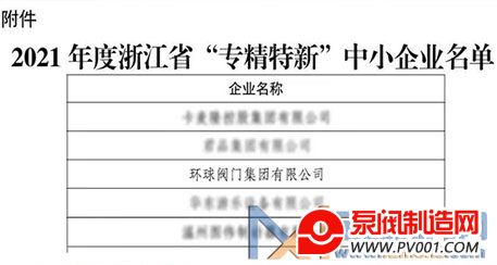 2022年1月5日,浙江省经济和信息化厅发布了《浙江省经济和信息化厅关于公布2021年度浙江省“专精特新”中小企业名单的通知》,环球阀门集团有限公司被认定为2021年浙江省“专精特新”企业。