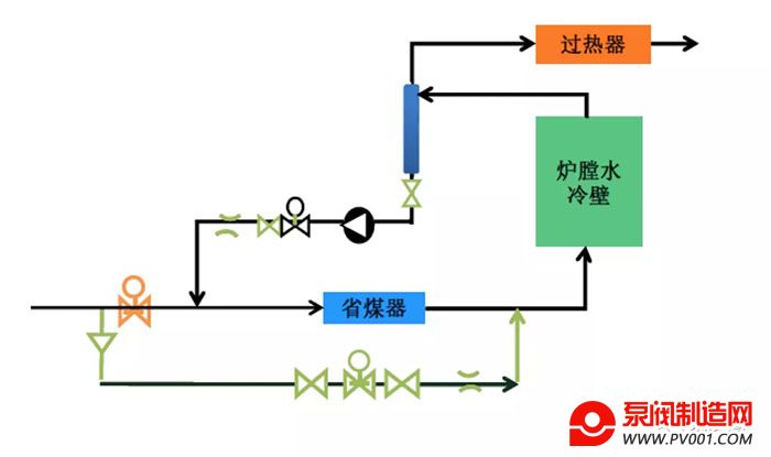 国内外的锅炉专家经过研究总结出,通过增设再循环泵线路,用锅炉循环泵将接近饱和的热水再次送入省煤器入口管道,在此处与锅炉给水汇合后并进入省煤器入口集箱,提高进入省煤器的工质流量和温度,降低烟气放热量从而提升省煤器出口烟温,此种改造针对不同炉型极限升温效果可达50℃左右,可完全满足宽负荷乃至全负荷下SCR脱硝的烟温调节需求。这种方法已经在国内外的电厂改造实践中得到证明。