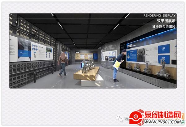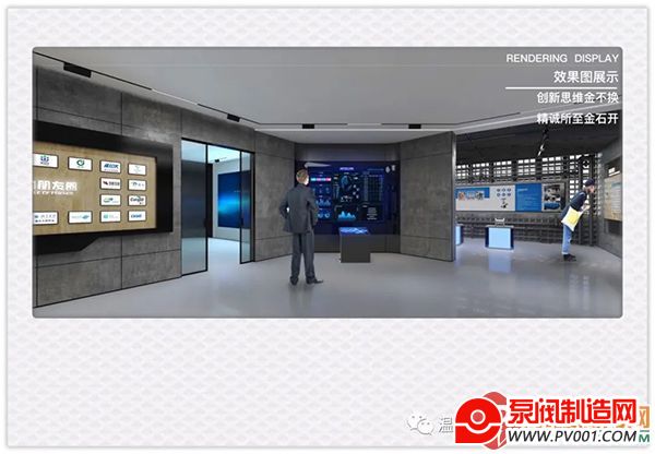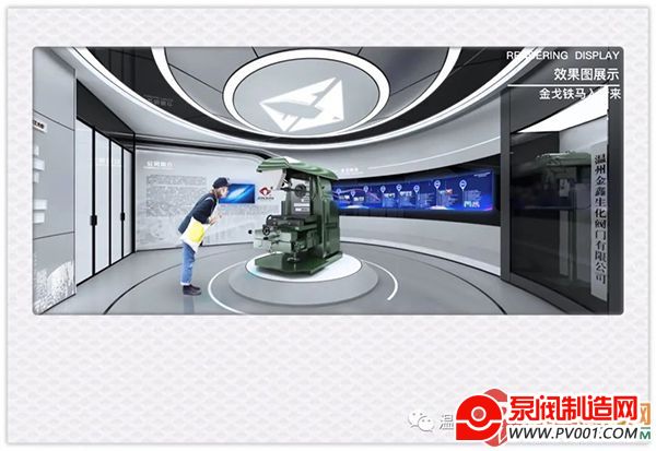 展厅整体风格以灰色、白色、黑色、蓝色为主色调,符合产品外观形象和行业特性,体现出现代感和科技感。展区中央天花板设计企业logo展示,对应企业具有纪念意义的老生产设备。同时在橱窗内展示特色老物件以及牌匾。以图文、屏幕形式介绍公司以及创始人相关资料,利用软膜灯箱介绍企业发展历程。同时以金属字介绍企业所获荣誉,墙面以穿孔板打造温州城市、金鑫剪影,整体以镜面不锈钢、定制铝板打造,增强展区硬朗、现代的观感。
