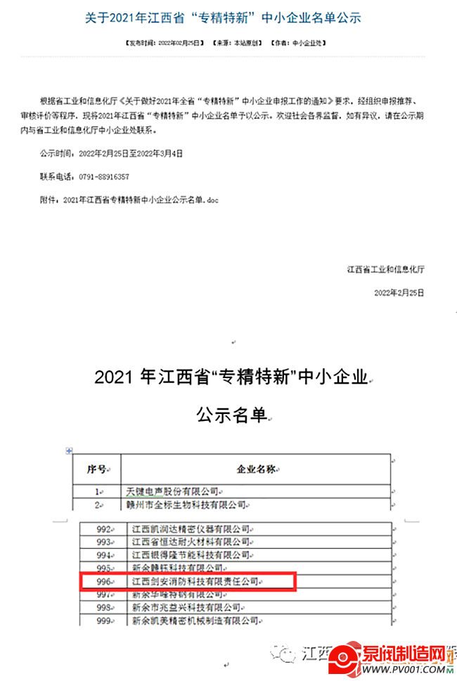 2月25日,省工业和信息化厅向社会公示了2021年江西省“专精特新”中小企业名单,江西剑安消防科技有限责任公司名列其中。据悉,该公示名单经组织申报推荐、审核评价等严格程序评定,被评定的企业在行业中均具有一定的代表性,剑安科技自2015年起已连续三度梅开成为江西省“专精特新”中小企业。
