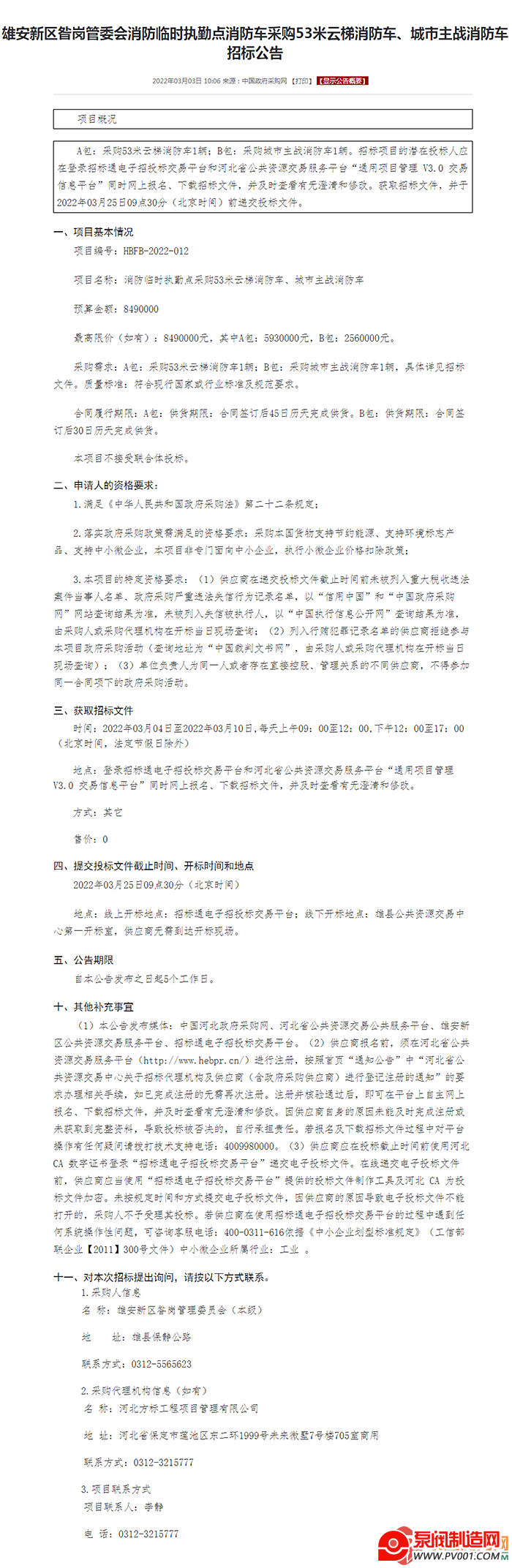 雄安新区昝岗管委会消防临时执勤点消防车采购53米云梯消防车、城市主战...