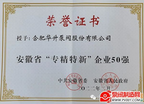 自获批国家专精特新小巨人企业、国家技术创新示范企业以来,华升泵阀再度入选安徽省“专精特新”企业50强,表明公司的技术领先、发展潜力、创新能力等得到了充分认同,更是各级政府、相关行业组织和社会各界对华升泵阀的肯定与鼓励。