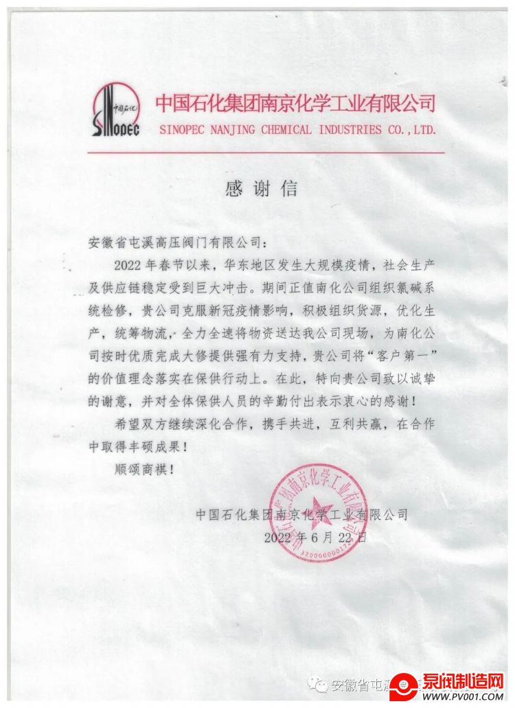 近日,安徽省屯溪高压阀门有限公司收到中石化南京化学工业有限公司发来的感谢信,感谢公司在疫情期间全力克服困难,保障南化公司大修项目提供强有力支持,并对公司“客户第一”的服务理念给予高度认可。