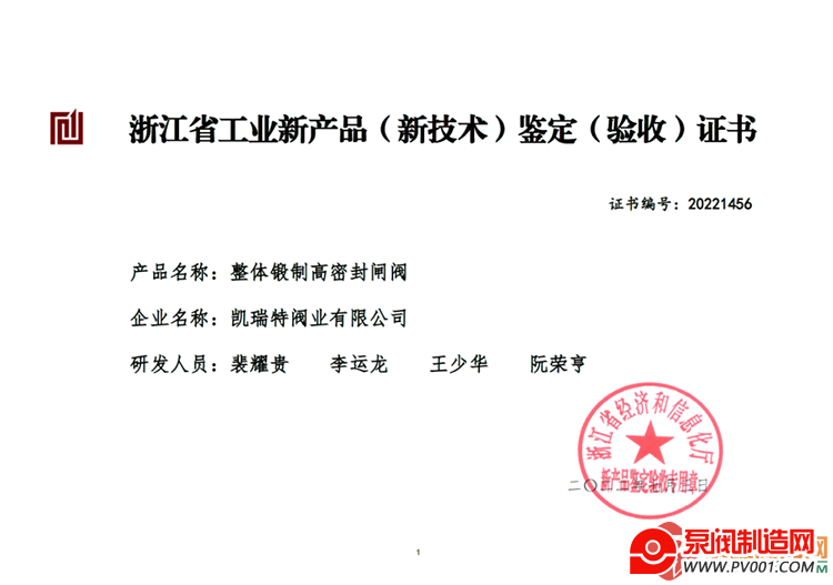 2022年6月17日,由凯瑞特阀业有限公司承担的两项省级工业新产品开发项目“LNG超低温一体式球阀”(项目编号:202143CN126)和“整体锻制高密封闸阀”(项目编号:202143CN085)通过了由浙江省经信厅组织的新产品鉴定。