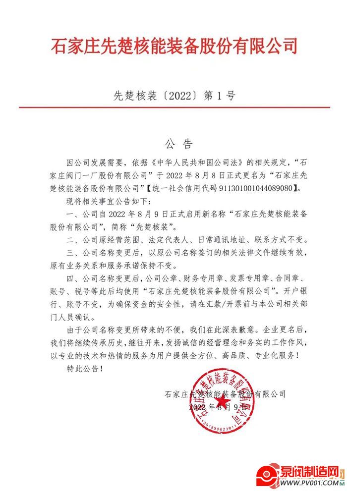 根据公司发展战略需要,经石家庄市行政审批局登记核准,自2022年8月8日起,“石家庄阀门一厂股份有限公司”名称变更为“石家庄先楚核能装备股份有限公司”,具体事宜公告如下。
