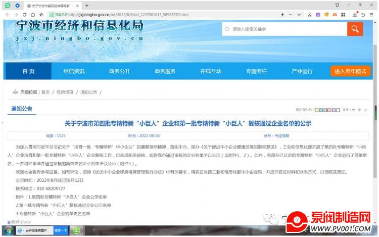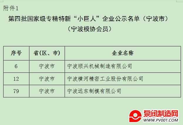 近日,宁波市经济和信息化局公布了“宁波市入选国家级第四批专精特新“小巨人”企业名单”。