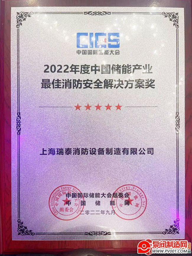 瑞泰消防储能解决方案及产品亮相CIES 2022年第十二届中国国际储能大会,并荣获“2022年度中国储能产业最佳消防安全解决方案奖”。