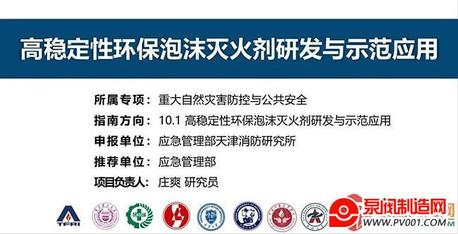 该项目由天津所联合南京理工大学、中国安全生产科学研究院、江苏锁龙消防科技股份有限公司、中国石油大学(华东)、中国矿业大学(北京)、天津大学、徐工消防安全装备有限公司、郑州大学、国安达股份有限公司等贯穿理论、技术、产品和生产全链条的综合研究和专项优势单位共同承担。针对现有泡沫灭火技术产品无法完全满足高效灭火和环境友好的现实问题,该项目以创新理论和先进技术为支撑,研制高效环保泡沫灭火技术装备,力争实现泡沫灭火剂产品研发、生产和应用技术领域的系统化整体性技术升级换代,为大型火灾高效处置提供有力技术支撑。