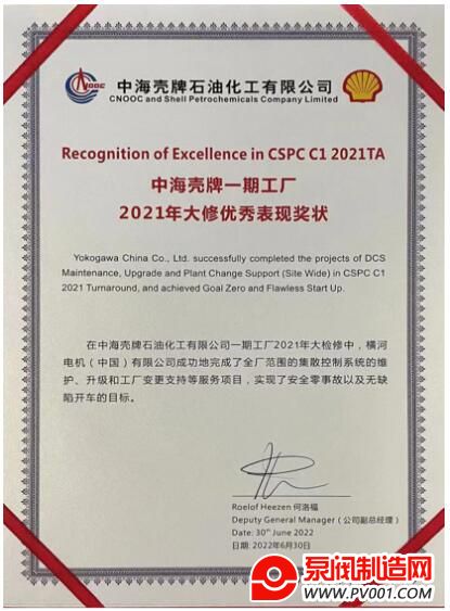 中海壳牌于2022年12月6日举行了中海壳牌一期工厂承包商表彰证书颁发典礼。横河电机由于成功完成了全厂范围的集散控制系统的维护、升级和工厂变更支持等服务项目,实现了安全零事故以及无缺陷开车的目标,获得中海壳牌一期工厂2021年大修优秀表现奖状。中海壳牌二期工厂2023年项目预计2023年10月启动,我们将继续全力以赴,再创佳绩。