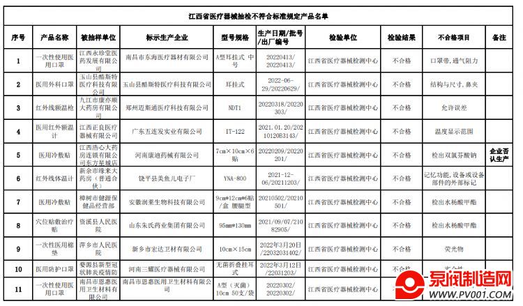 为加强医疗器械质量监督管理,保障医疗器械产品使用安全有效,江西省药品监督管理局按照2022年度全省医疗器械抽检工作方案,持续对本省医疗器械生产、经营和使用环节实施了监督抽样检验。本期对已核实的11批次不合格产品予以公告。