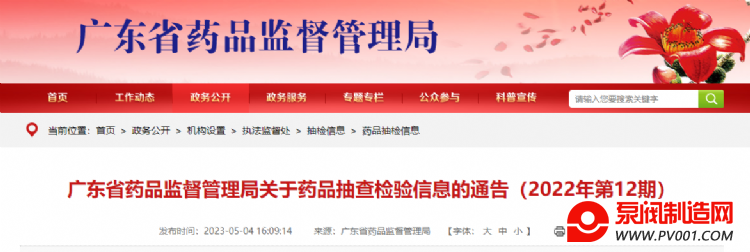 讯 2023年5月4日,广东省药品监督管理局网站发布关于药品抽查检验信息的通告(2022年第12期)。通告称,为加强药品质量监管,保障公众用药安全,根据广东省药品抽检计划,广东省药品监督管理局组织对全省药品生产、经营、使用环节进行药品质量抽查检验,现将药品抽样检验信息予以公布。