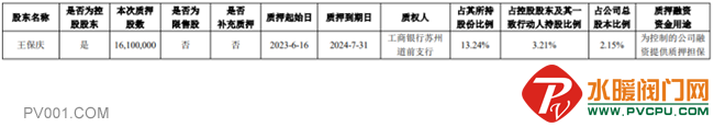 公告显示,王保庆共持有公司股份数量为121,564,912股,占公司总股本比例为16.23%。累计质押58,440,000股股份,占其所持有股份比例为48.07%,占公司总股本比例为7.80%。