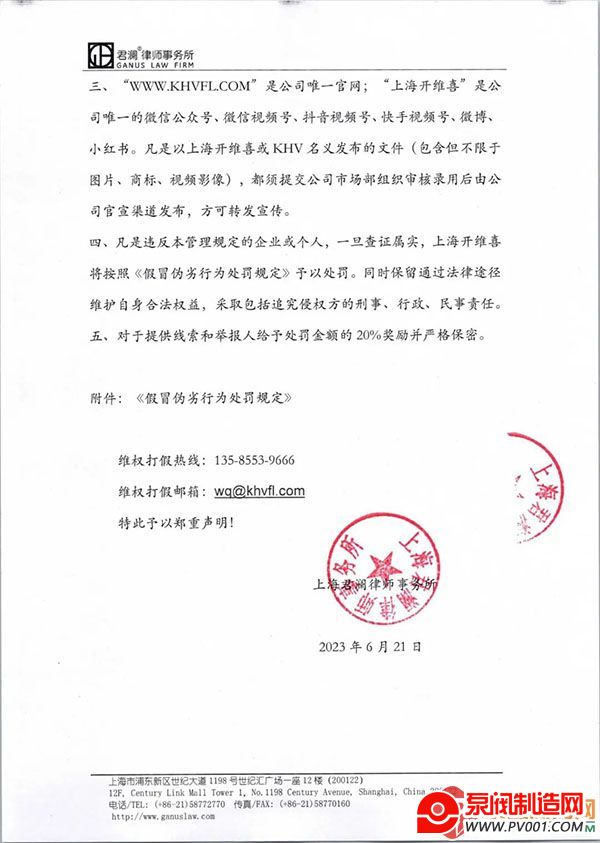 三、“WWW.KHVFL.COM”是公司唯一官网;“上海开维喜”是公司唯一的微信公众号、微信视频号、抖音视频号、快手视频号、微博、小红书。凡是以上海开维喜或KHV名义发布的文件(包含但不限于图片、商标、视频影像),都须提交公司市场部组织审核录用后由公司官宣渠道发布,方可转发宣传。