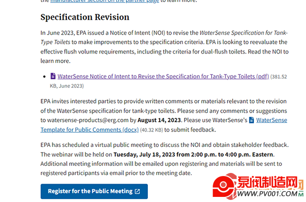 2007年,美国环保署发布WaterSense计划,美国多个政府要求新安装马桶必须有WaterSense 标签,意味着新安装的马桶必须通过用 1.28 加仑或更少的水冲洗 350 克豆酱的测试——这比当前联邦标准每次冲水最多 1.6 加仑(gpf)至少少 20% 的水。考虑到许多用户并不会正确使用合适的冲水键,美国环保署考虑将双抽水马桶的最大冲水量与单抽水马桶的最大冲水量修改为一致。