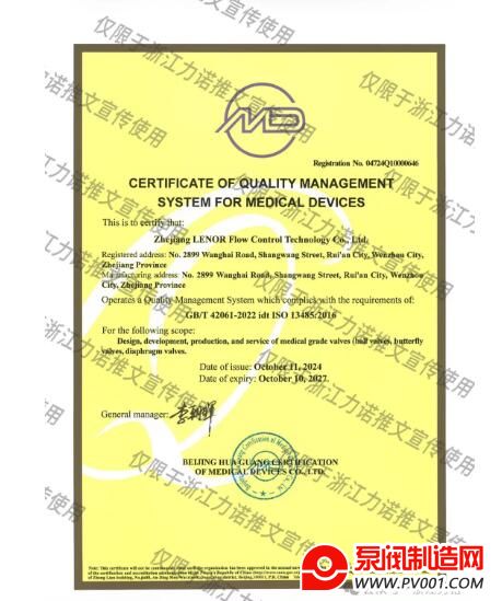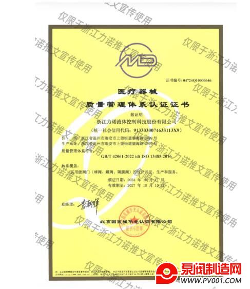 尽管公司生产的阀门并非直接归类为医疗器械,但公司主动申请并成功取得GB/T 42061的认证,这不仅是对浙江力诺向医用级别阀门制造迈进的坚定承诺与强大能力的展现,也是对设计、生产至服务全链条整合管理的一次全面肯定。