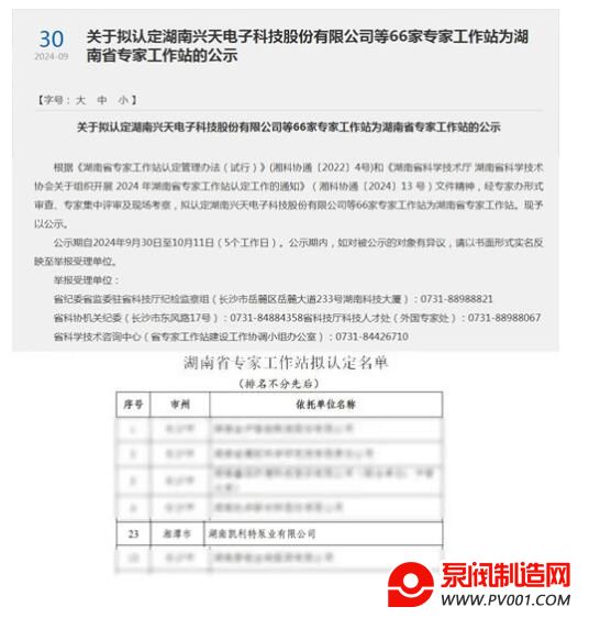 近日,根据《湖南省专家工作站认定管理办法(试行)》(湘科协通(2022〕4号)和《湖南省科学技术厅 湖南省科学技术协会关于组织开展2024年湖南省专家工作站认定工作的通知》(湘科协通〔2024〕13号)文件精神,经专家办形式审查、专家集中评审及现场考察,认定了66家湖南省专家工作站,其中湖南凯利特泵业有限公司(以下简称凯利特泵业)获评上榜,这一荣誉不仅是对凯利特泵业在科研创新、人才引进及培养方面工作的高度认可,也标志着凯利特泵业在推动地方经济和社会发展中所作出的努力得到了省级层面的支持。