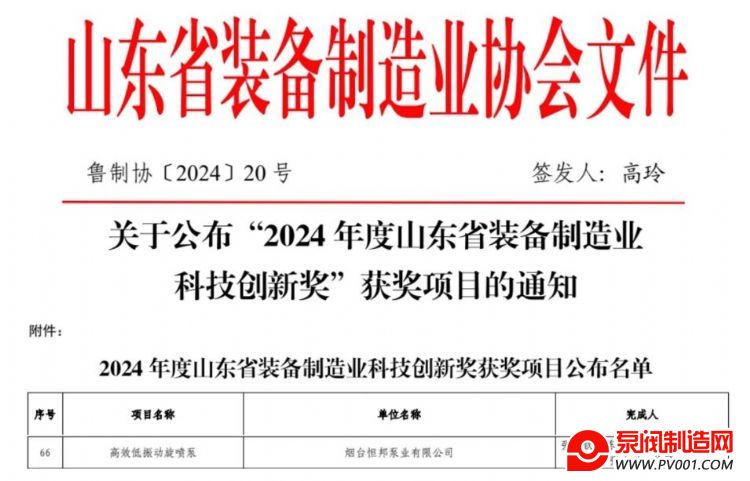 近日,烟台恒邦泵业有限公司自主研发的“高效低振动旋喷泵”,荣获了2024年度山东省装备制造业科技创新二等奖。