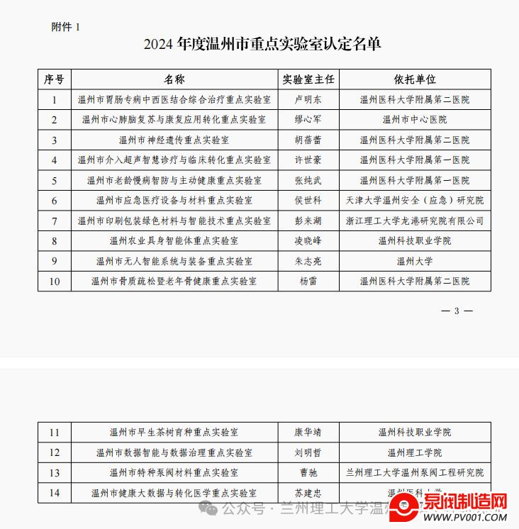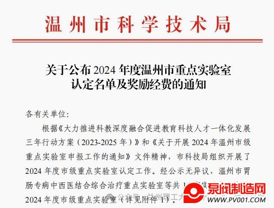 近日,温州市科学技术局公布了《2024年度温州市重点实验室名单认定名单》,由兰州理工大学温州泵阀工程研究院牵头申报的“温州市特种泵阀材料重点实验室”成功获批温州市市级重点实验室!历经不懈努力,这是我院首次成功获批市级重点实验室,标志着我院科研工作迈上新台阶,为我院新一轮共建建设注入强劲动力!