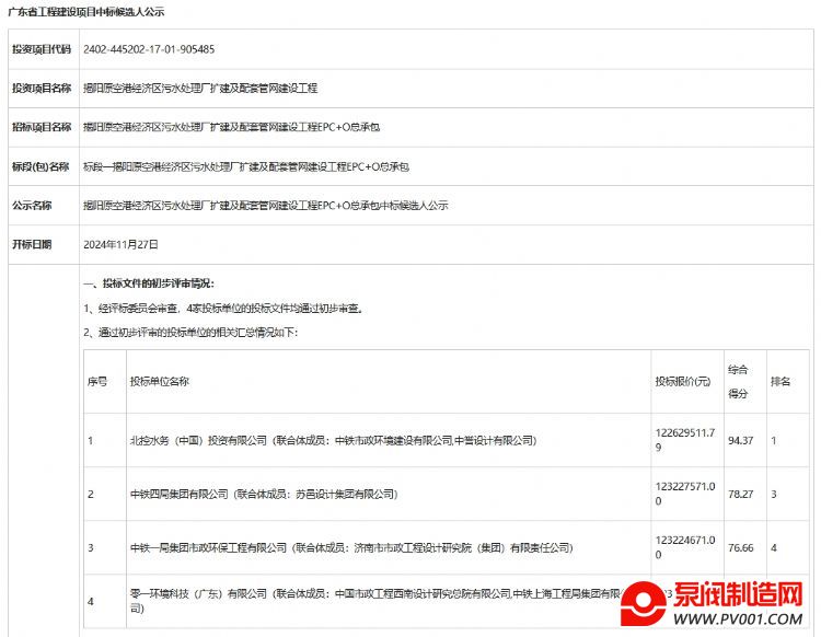 近日,揭阳原空港经济区污水处理厂扩建及配套管网建设工程EPC+O总承包中标候选人公示。