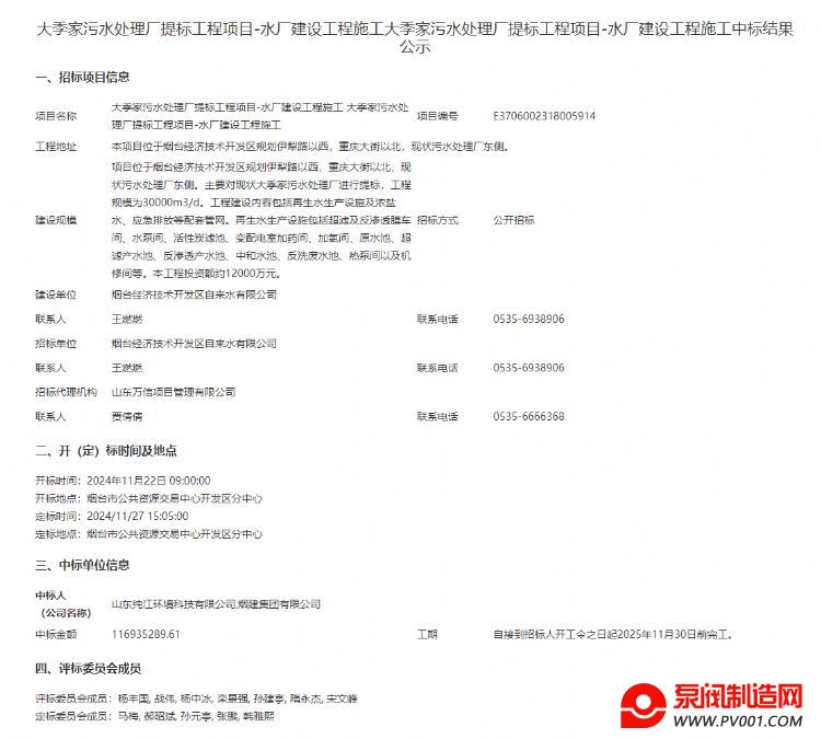 近日,山东大季家污水处理厂提标工程项目中标结果公示,中标人山东纯江环境科技有限公司、烟建集团有限公司,中标金额 116935289.61元。