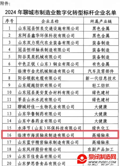12月24日,聊城市工业和信息化局公布2024年聊城市制造业数字化转型标杆企业名单,唐园镇临清市海滨轴承制造有限公司成功入选聊城市制造业数字化转型标杆企业。