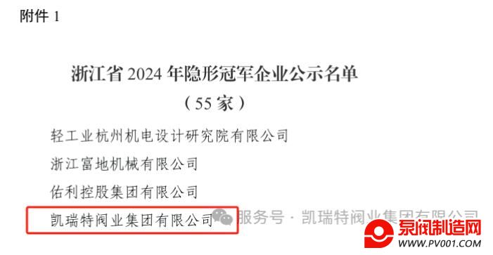 恭喜凯瑞特阀业集团有限公司上榜浙江省2024年隐形冠军企业!“隐形冠军”企业,指的是那些在某个细分行业或市场中占据领先地位,并且拥有核心竞争力的中小型企业。凯瑞特阀业集团有限公司,在中石油石化油田领域精耕细作,在近年中国石油供应商评比排名中荣获 A级供应商的殊荣,在我国石油与化工行业中具有较高的知名度和美誉度,近年来在石油行业油田板块阀门生产与销售数量浙江省排名第一,全国排名位居前三位,市场占有率为 22%以上。