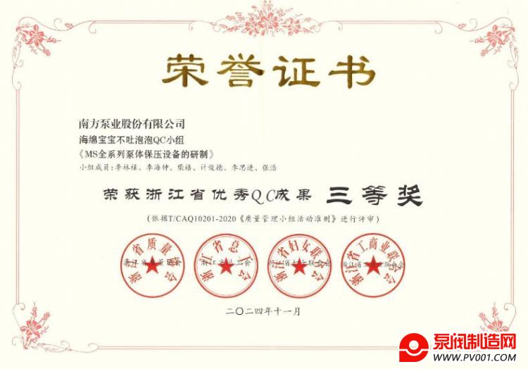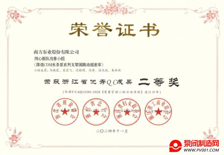 近日,2024年浙江省优秀QC小组成果评选结果公布,中金环境旗下南方泵业参赛项目《降低CDM水务泵系列支架圆跳动超差率》及《MS全系列泵体保压设备的研制》分别获得2024年“浙江省优秀QC成果”二等奖和三等奖。