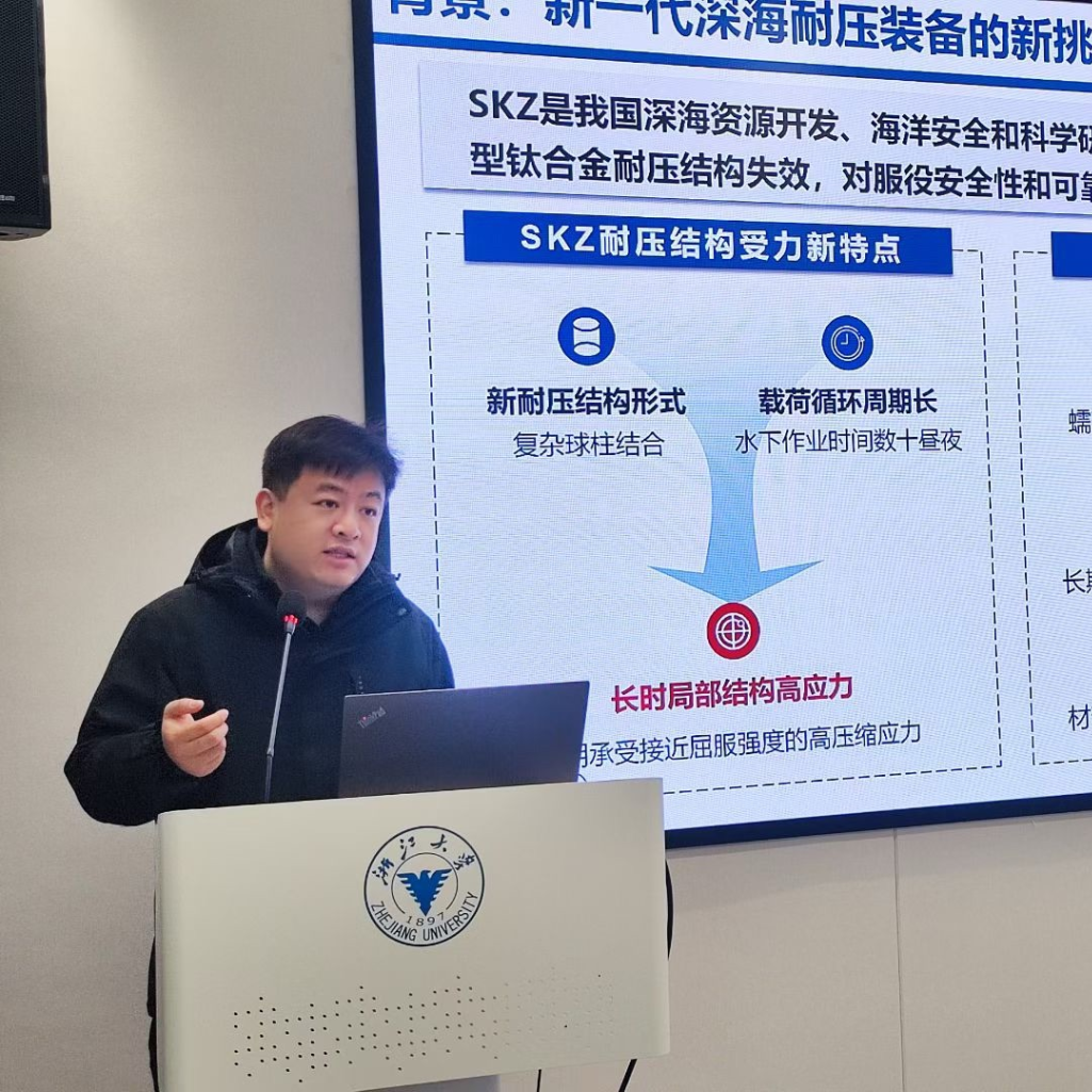活动首站来到浙大玉泉校区,聚焦 “深海耐压装备用钛合金的蠕变变形研究” 主题,企业代表们聆听了卜叶强博士的专题报告。报告中,卜博士深入浅出地讲解了钛合金材料在深海极端环境下的性能表现与蠕变机理,为紧固件在深海工程、航空航天等严苛环境下的应用提供了全新的技术视角与材料解决方案。