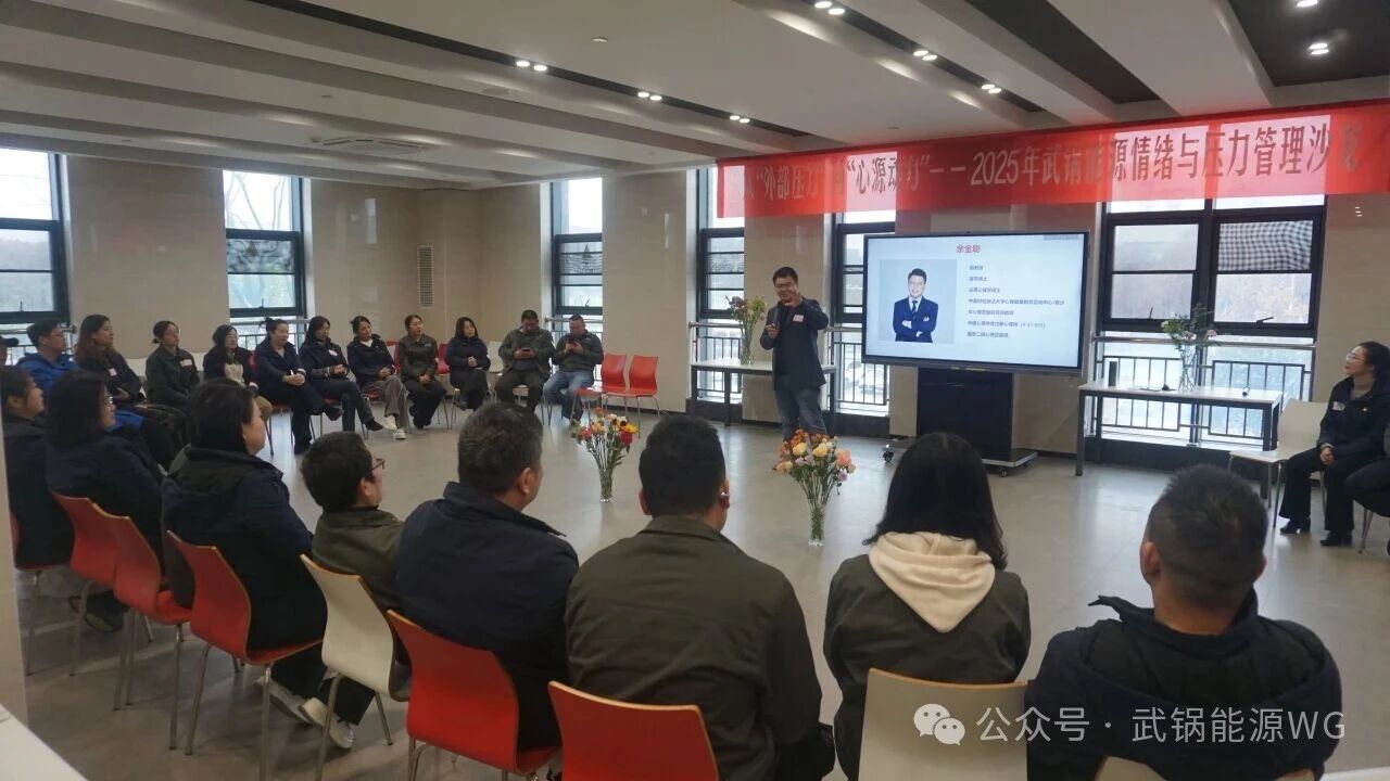 为丰富员工生活,关爱员工身心健康,释放职场工作中的心理压力和负面情绪, 2025年12月4日,武锅能源公司在技术大楼二楼组织开展“压力减载 共筑能量”减压赋能团辅活动。活动由爱康体检心理服务中心负责老师主讲,来自公司各部门的40余名员工参加了沙龙活动。