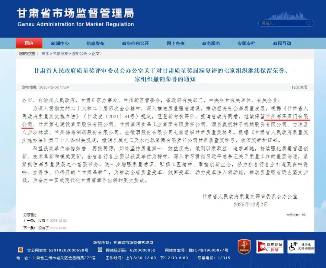 近日,甘肃省人民政府质量奖评审委员会办公室发布通知,经严格复核评审,兰州高压阀门有限公司顺利通过“甘肃质量奖”复评,继续保留该项荣誉称号。