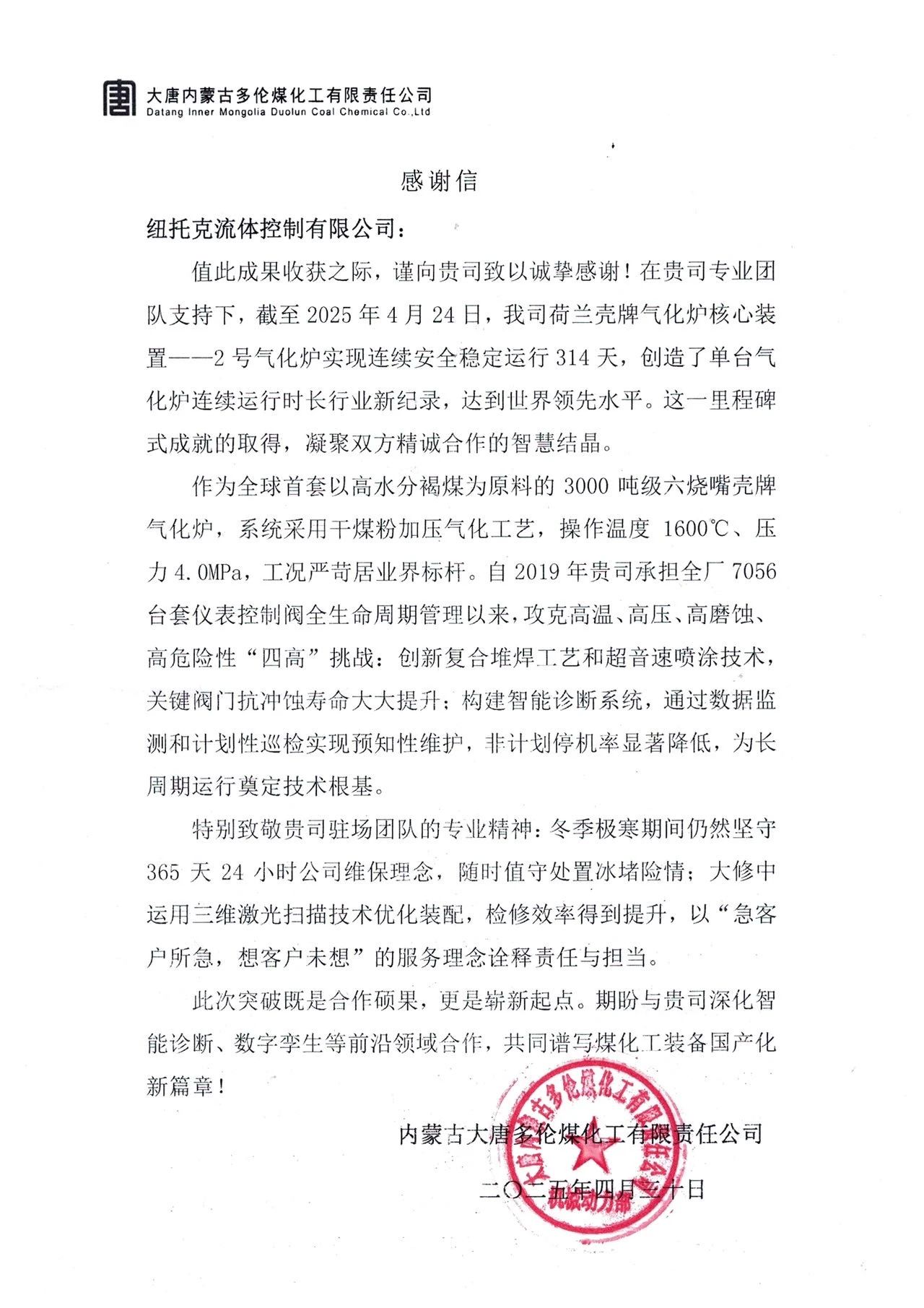 近日,由纽托克流体控制有限公司全程护航的内蒙古大唐多伦煤化工2号气化炉,以连续安全稳定运行314的卓越表现,打破全球行业纪录,登顶煤化工领域长周期运行新高度!这一里程碑式成就,不仅彰显了纽托克在严苛工况下的技术实力,更标志着中国煤化工装备国产化迈向世界领先水平!